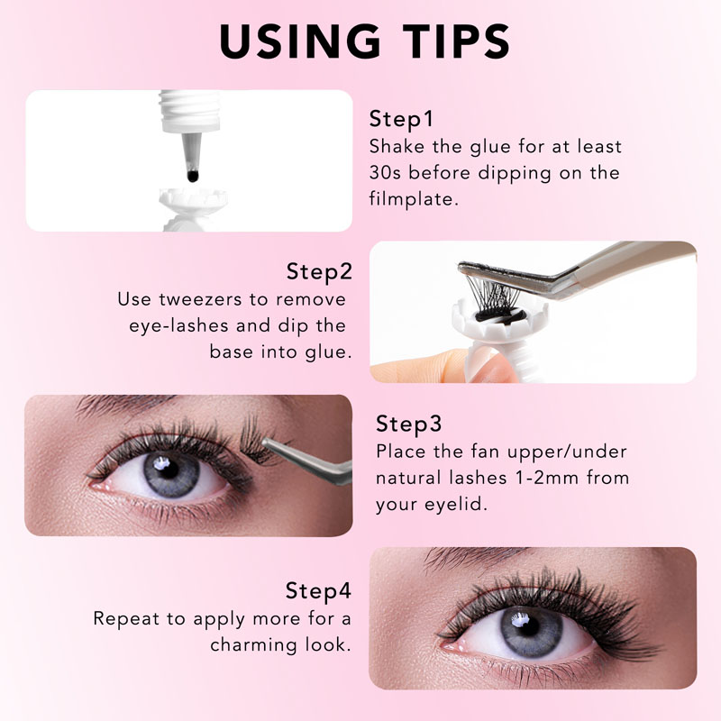 आवेदन प्रक्रिया त्वरित और आसान है। अपने वांछित लैश क्लस्टर का चयन करके और उन्हें एक सपाट सतह पर बिछाकर शुरू करें। फिर, प्रत्येक क्लस्टर के आधार पर हमारे DIY लैश क्लस्टर गोंद की एक छोटी राशि लागू करें। DIY लैश क्लस्टर गोंद को कुछ सेकंड के लिए सूखने दें और फिर धीरे से अपने प्राकृतिक पलकों पर क्लस्टर को दबाएं।